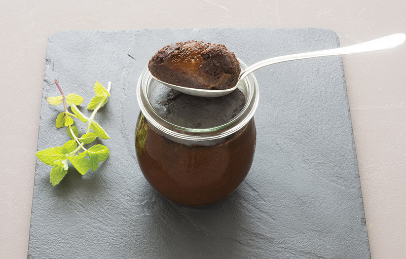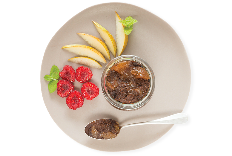 Le fondant au chocolat et morceaux de poires sera irrésistible accompagné de framboises fraiches et de menthe finement ciselée.