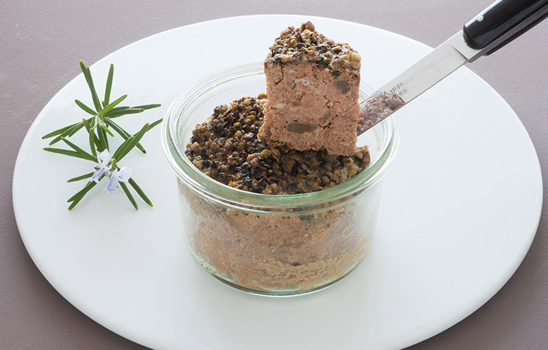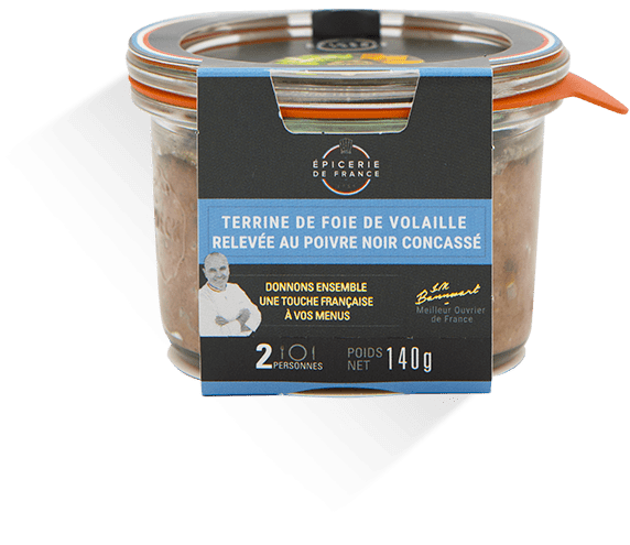 « La rencontre de deux produits de caractère : la terrine de foie de volaille mêle son poivre noir au pain de campagne traditionnel »