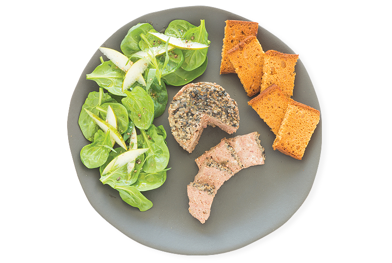 Mettre en valeur la terrine de foie de volaille relevée au poivre noir concassé c’est l’enrichir d’une salade de pousse d’épinards à la poire et à l’estragon. Un chutney de figues sur des tranches de pain d’épice grillées apportera la touche finale à la terrine.