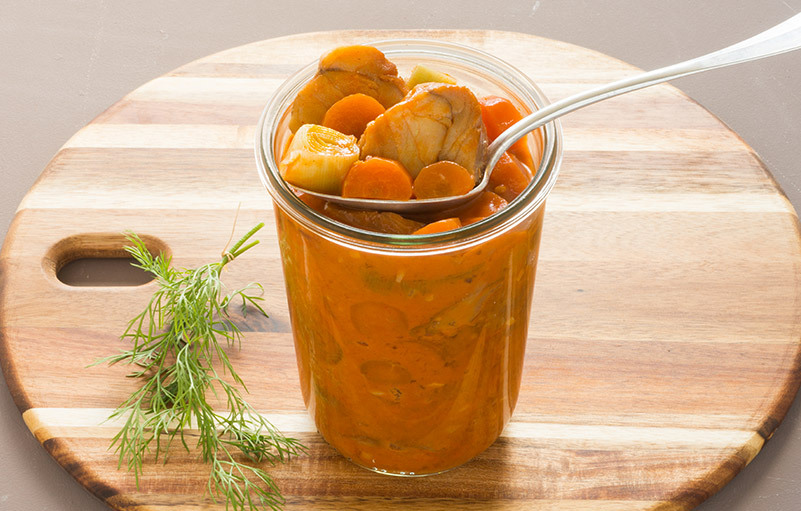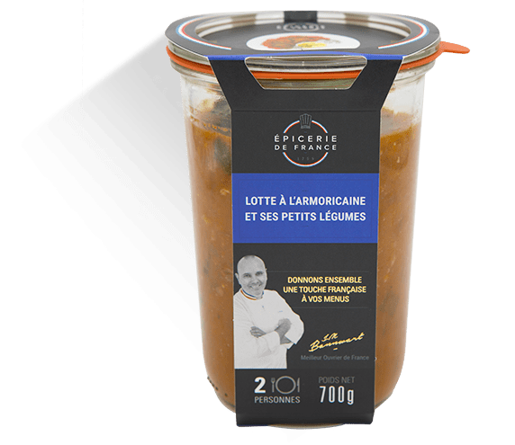 Lotte 40%, eau, carottes, blancs de poireaux, crème fraiche (lait), concentré de tomate, amidon, épices et aromates (dont piment de Cayenne), tomate au jus, Cognac, vin blanc, beurre, extrait de crustacés, sel.